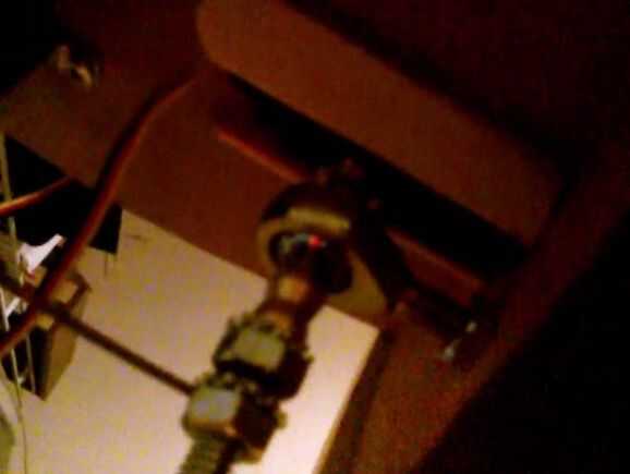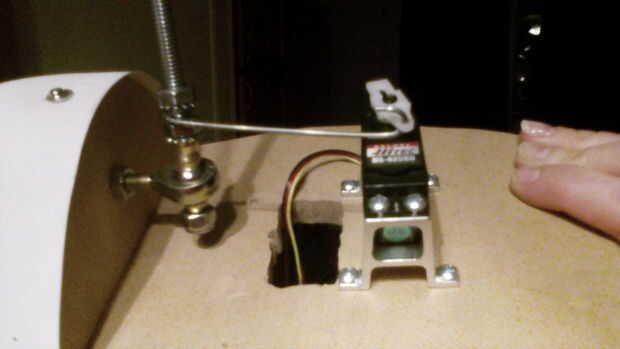 Un 1/4" tuerca de fijación fue agregado debajo de la manga de compresión inferior y una varilla de grueso calibre (es la parte metálica de una bandera de riego) fue atada y utilizada como un brazo de servo. Otro 1/4" tuerca de fijación se utilizó para mantener el brazo en su lugar y un soporte de servo vertical adicional fue utilizado para fijar el servo.