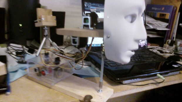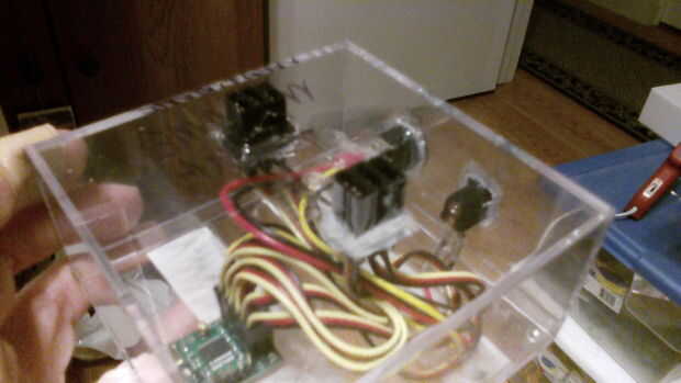 Mediante un cuadro de la pequeña pantalla, los cables de extensión de servos fueron funcionados del controlador en la parte superior de la caja. Esto permitió para una fácil conexión para los servos. Los cables también fueron funcionados para la alimentación y un interruptor on/off. Se realizó un pequeño agujero en el lado para permitir al mini usb para conectarse para programar los servos.