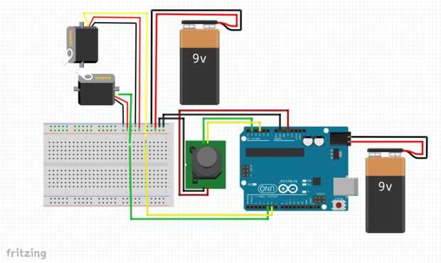 En mi esquema utilicé dos fuentes de alimentación, porque si se mueve un servo a veces drena mucho poder y se apaga el arduino. Pero también se puede utilizar un condensador y por ahí hay algunos ejemplos en Google. el servo que he utilizado utiliza 9v de todos modos por lo elegí, pero algunos funcionan bien en 5v que entrega el arduino.