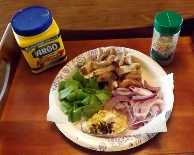 Poner verduras preparados en un plato de papel o un plato y ponga en el lado de la estufa, listo para cocinar.