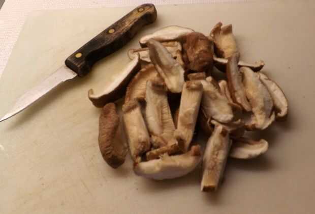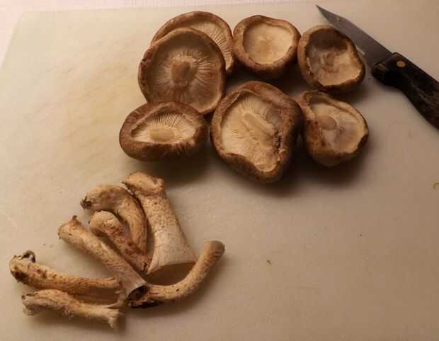 - Retire y deseche los tallos de hongos Shiitake; corte tapas de setas en tiras de 2" de largo.