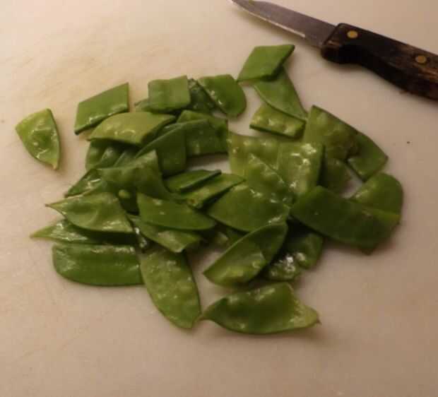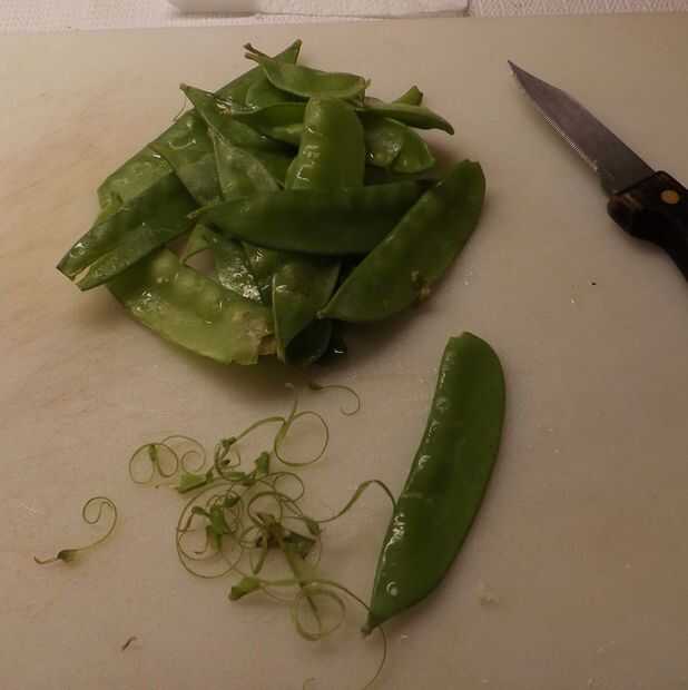 - Enjuague vainas de chícharos, quitar cadenas, pat seco, cortar las vainas en 3 piezas (2 piezas - o mitades - si pequeña).