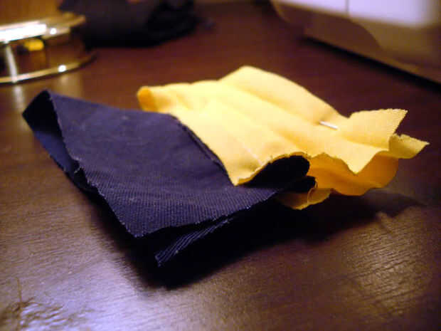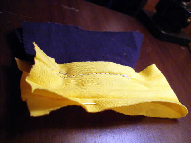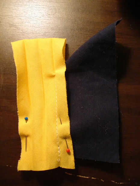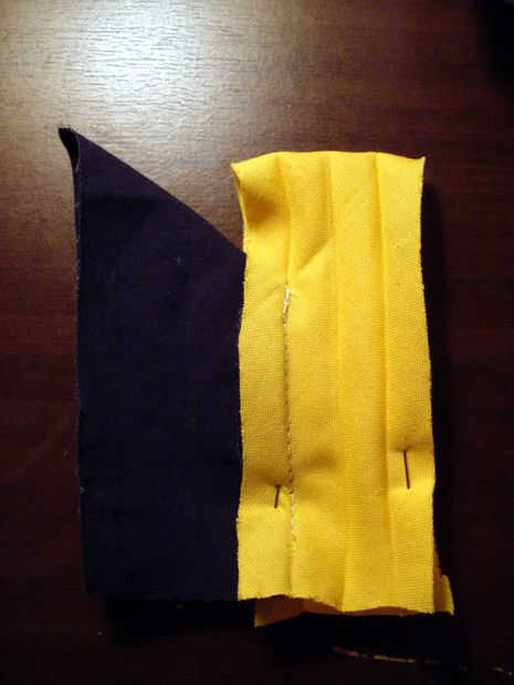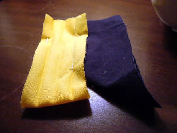 La siguiente parte es la más difícil de visualizar, por lo que he incluido unos cuantos cuadros de referencia. Tomar dos de sus bordes de cinta de bies y ponerlos juntos, por lo que la longitud de la cinta corre en línea recta. Debe buscar más o menos el mismo en ambos lados. La fotografía tomada desde la parte inferior debe ayudar a ilustrar cómo es