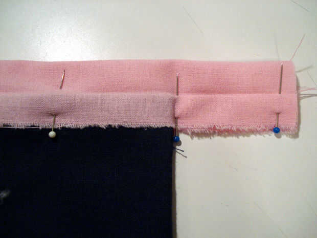Ahora toma la parte superior de su cinta y doble hacia abajo sobre la parte superior de su borde de la tela, formando un sándwich de tela sabroso.