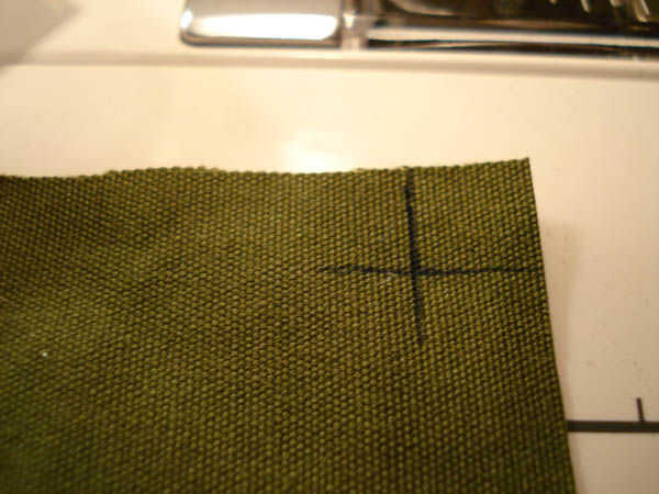 Tomar la cinta línea hacia arriba y marca donde la costura estará en su esquina de la tela. Hacer lo mismo desde la otra dirección, y usted tendrá dos líneas guiándote por el siguiente paso.