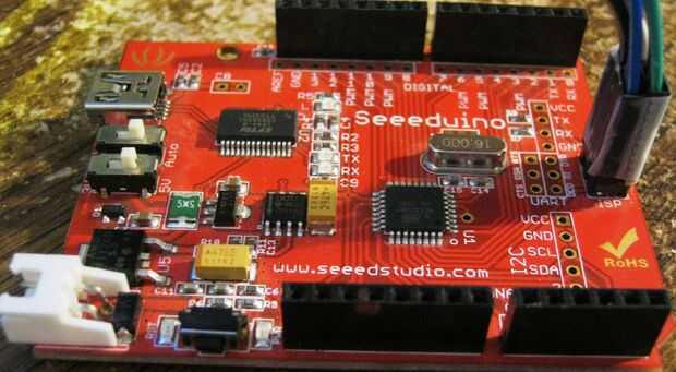 Problema: Bueno, mi Instructable segundo funciona bien para Atmega328s en un zócalo, pero tengo un Seeeduino que utiliza un Atmega de SMD. Así que no puedo bootload con mi ICP. Vea la foto.