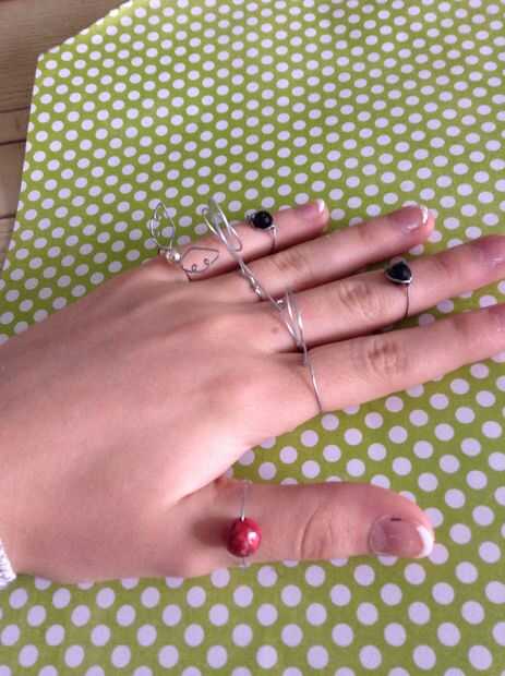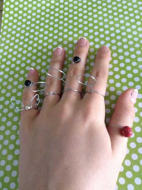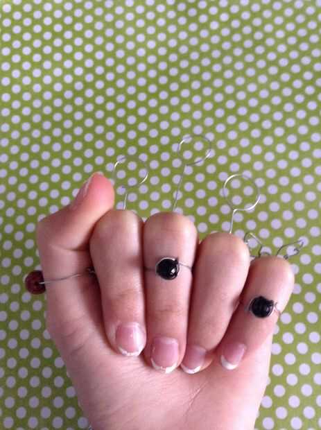 Hacer anillos de todos los granos que tienes y organizar alrededor de los dedos para que la cadera más larga está en el centro y los más cortos son de dos partes y poner los granos en otros dedos se podrían incluso en capas los granos en la parte superior donde están los aros (*** si usted quiere, usted puede doblar hacia abajo el aros como se muestra abajo ***)