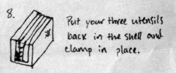 Poner todas las piezas en forma 3 en la concha y todo por la forma que desee cuando se hace la línea.  Sin interrumpir esa colocación, sofocar la cosa en el extremo donde están los dientes de horquillas y puntas de cuchillo y cuchara.  Luego marque en el otro extremo a un punto que está directamente en el centro de la anchura de la pieza y esa misma medida desde el extremo de la pieza.  Dibuja un círculo (si quieres) que es el diámetro de su espiga.  Esto es donde irá la bisagra para que la idea 'mueve piezas' trabajar.