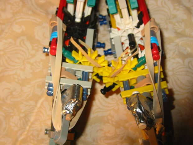 Los pernos de la leña debe ser alimentados por bandas de goma. El ancla puntos para las bandas de goma son son (enfrente del lado de gatillo) el soporte estructural (lado disparador) la barra azul de la manija. Tomar dos gomas, atan para arriba y su nudo de combinación de la materia en conector gris oscuro del percutor.
