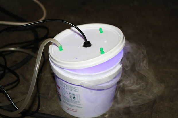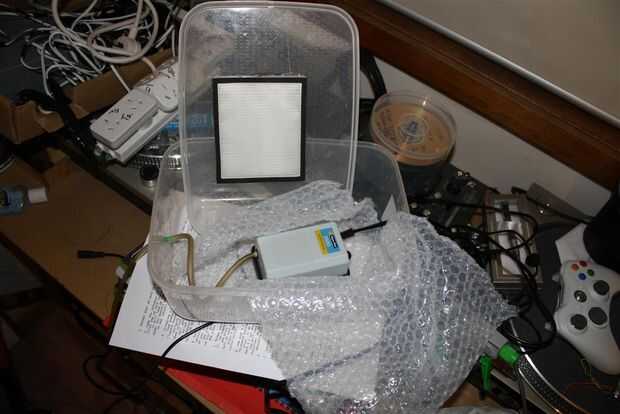 En el otro extremo de este tubo era una bomba de aire dentro de una tina hermética. La tapa de la bañera tenía un agujero cortado y estaba cubierta por un filtro HEPA. La razón para el filtro HEPA es por lo que va en el aire de alimentación las setas no está contaminado con bacterias y otros hongos.