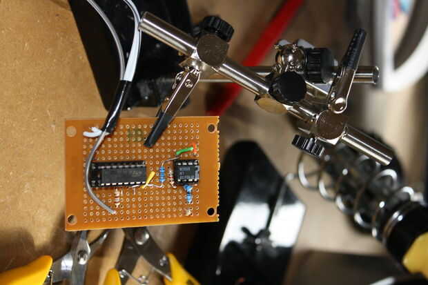 Usé este circuito para enviar pulsos de datos a Arduino. Al principio encontré los pulsos estaban demasiado juntos y no dio alto suficiente discriminación, por lo que a la salida de los 555 puse una brecha digital por la viruta de diez. Este hecho por lo que la longitud de onda de pulsos fue en los cientos de microsegundos en lugar de las decenas de microsegundos.