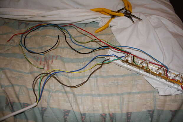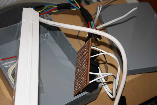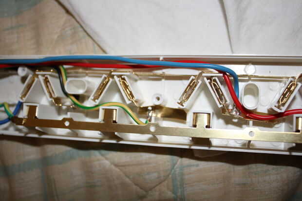 Apertura de la placa de potencia quita la tira de cobre los activos de conexión y cortar en cuatro piezas separadas. Soldadas en cada pieza fue uno de los cuatro cables que se sueldan en uno de los pasadores de carga de cada uno de los relés.