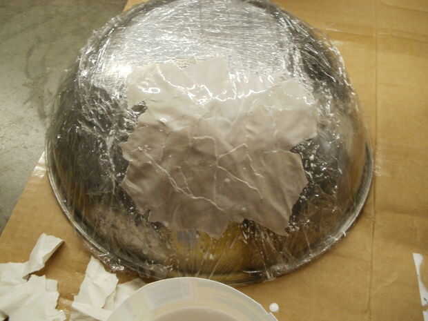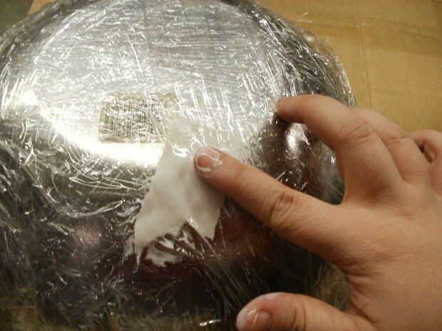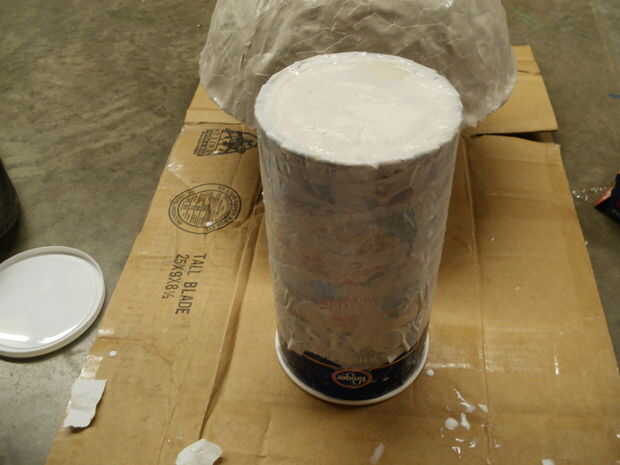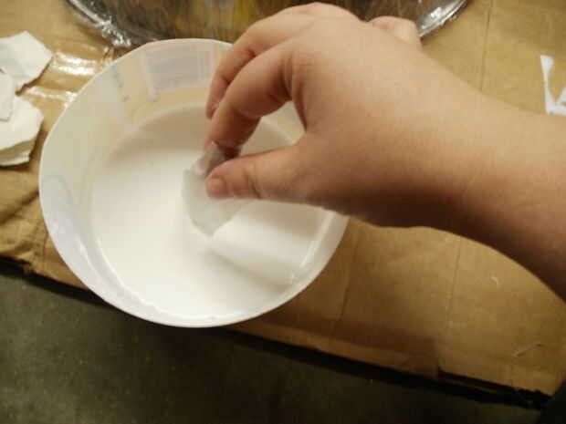 Comenzar el proceso de papel maché. Sumergir las piezas de papel en el pegamento y quitar el pegamento extra ejecutando a través de los dedos. Luego aplicarlo a la taza. Competely cubre el tazón de fuente. Entonces cuando termines con el recipiente, cubra el recipiente avena con papel y pegamento. Deje que ambos objetos se seque.