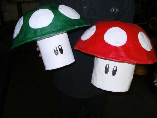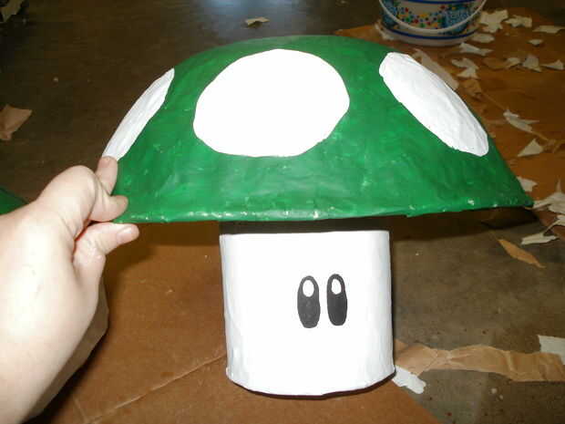 Pintar su seta con pintura acrílica. El primero que hice usé un top rojo con círculos de color blanco para la típica seta.  Si quieres hacer un 1up y luego cambia a verde con círculos blancos.  La base blanca de pintura y no olvide los ojos ovales negro!  Probablemente tardará al menos 2 capas de pintura.   Usé un sellador de lata aerosol brillante para acabar con ellos para arriba.