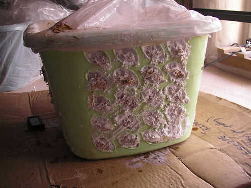 3. Compruebe en la canasta después de una semana.  Usted debe comenzar a ver micelio blanco crece en algunos de los agujeros.  Cubierta y comprobar otra vez en una semana.