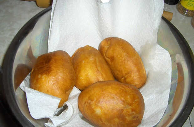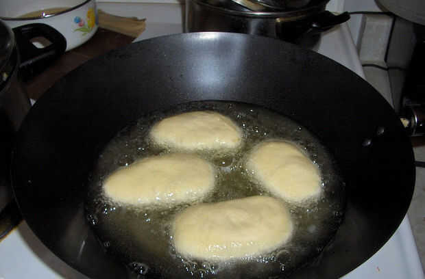 Coloque la masa llena de hornear, costura en la parte inferior. Repita hasta que todos los aplanan bolas están llenas. Puede freírlas de inmediato, o puede dejar parado a doble tamaño otra vez (durante otros 20 minutos) antes de freír.