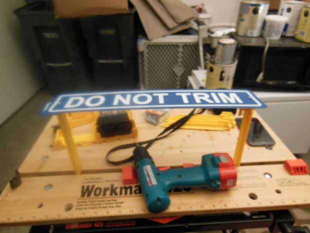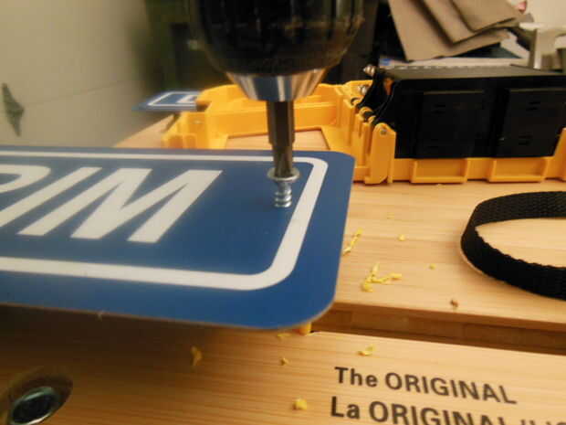 Con sus pinzas en el tornillo de banco o mesa de trabajo, cambiar a una broca cabeza phillips y atornillar los tornillos para madera #10 a través de los orificios de los signos y abajo en los agujeros de las clavijas de la tienda. Tómese su tiempo y atornillarlas lentamente para evitar la cabezas de los tornillos pelados y tornillos torcidos.