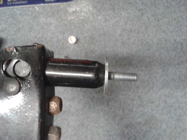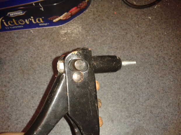 Ahora ponerlo todos junto pase el tornillo largo por la parte posterior de la cabeza y el pivote debe ser lo suficientemente largos para enganchar completamente con el remache roscado. El remache roscado debe ser tirado hacia atrás contra una superficie plana y utilicé una Arandela gruesa de penny. Ahora Asegúrese de que al abrir y cerrar los identificadores de la rosca es jalada hacia atrás a la cabeza y lanza adelante sin coger.