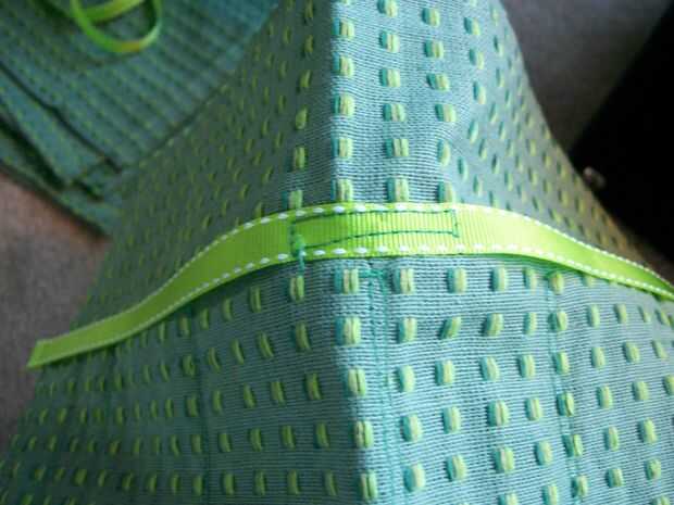 Para rematar sus nuevos titulares de cubiertos, cortar cuatro tiras de cinta de algunas pulgadas más largas que la longitud de los soportes de los platos y cubiertos (doble extremos doble y coser juntos si el desgaste de la cinta, permitiendo más cinta para esto) y al exterior del titular cubiertos apenas por encima de las aberturas del bolsillo. Voltee y asegúrese de que no se coser las aberturas cuando usted fije la cinta de opciones. Coser a lo largo de ambos bordes de la cinta de atar los extremos del hilo y cortar el exceso de hilo.