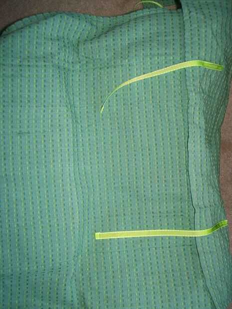 Doblar la aleta y tenga en cuenta que las cintas de reunirse con la otra toalla. Prender las otras dos cintas a la línea de arriba con las cintas en el piso. Otra vez, doblar los bordes crudos bajo y cose ambos bordes de cada cinta a medio camino hacia el borde (apertura lateral).