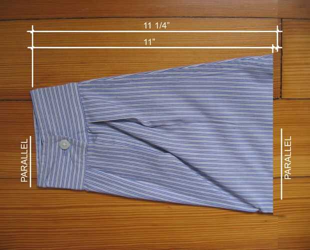 Así como no dejar el extremo cortado de la manga de la camisa expuesta, hacer un 1/4" dobladillo a lo largo de todo el borde del corte. Doble en el interior, como estás dobladillo un par de pantalones--y planche el dobladillo lo pliegue y mantener en su lugar. (Alternativamente, puede prender el doblez en lugar temporalmente, pero con todo el almidón que usaste, no tienes que!)