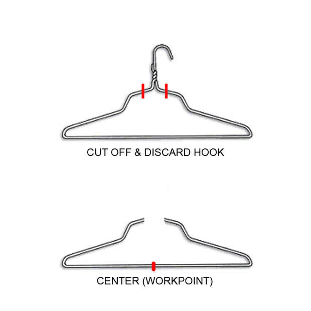 Tomar una percha de alambre y con alambre tijeras para cortan el gancho como se muestra en el diagrama de Quite y deseche el gancho y la cuerda. Tenga en cuenta la ubicación de 'centro' se muestra en el diagrama.