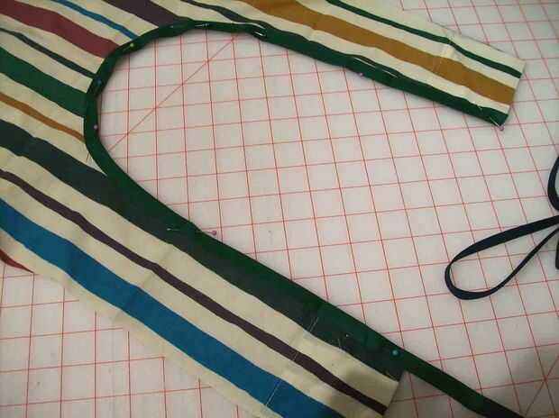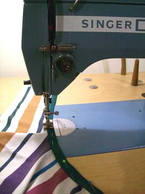 Prender la cinta alrededor de la abertura y los lados de las manijas. No es necesario enlazar las tapas de las manijas. Coser la Unión, cerca del interior borde. Prensa.