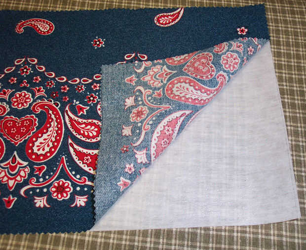 Ahora, corte dos piezas de tela de 14 1/2" ancho x 9 1/4" alto de la tela que hayas elegido para los bolsillos. A continuación, cortar dos piezas de entretela, en el mismo tamaño y fusible a cada uno en la parte posterior de cada tela de bolsillo.