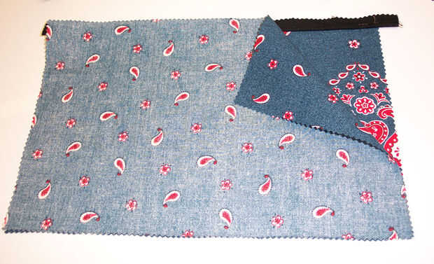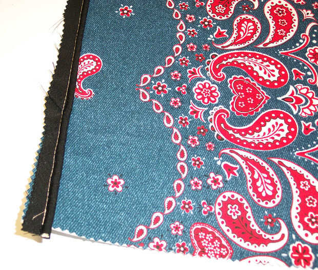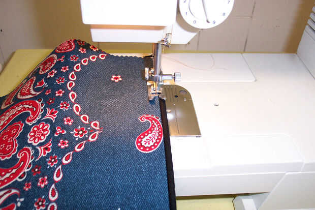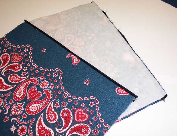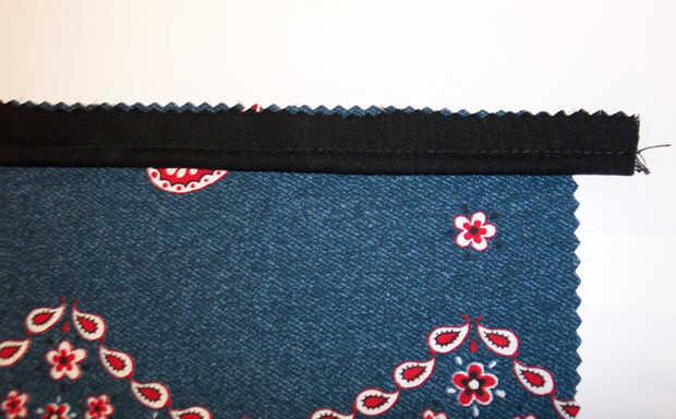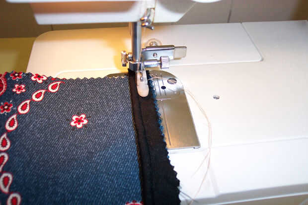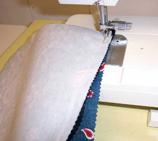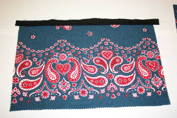 Lugar próximo, la tela de forro derecho por encima de los cordones con el labio como se muestra en la imagen. Los cordones se encuentra ahora entre su forro y la tela para el bolsillo. Coser a través de. Repita el mismo procedimiento para el segundo bolsillo.