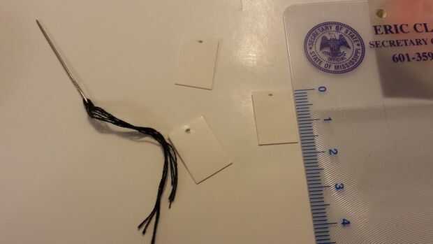 Esta parte es un poco exigentes, pero sólo ir lentamente y no forzarlo. Ayudó a apoyar el espacio en blanco poniendo en unos pedazos de cartón de desecho. Cuando termines, recorren un doble espesor de hilo hacia adelante y hacia atrás para alisar hacia fuera el agujero (y para asegurarse de que cabe).