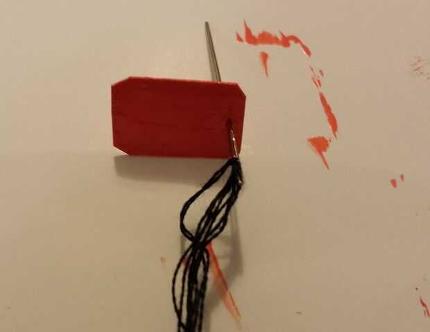 Pintar la cartulina naranja en ambos lados, usando solamente suficientes capas para cubrir el cartón y dejar seco completamente. Mientras que todavía pegajoso, pasar la aguja por el orificio para asegurarse de que todavía está claro; hacer esto cada vez está secando. Aprendí que si ensarta la aguja, podría poner a través del agujero y descansar sobre una superficie plana, dejando ambos lados seco a la vez.