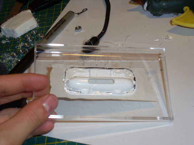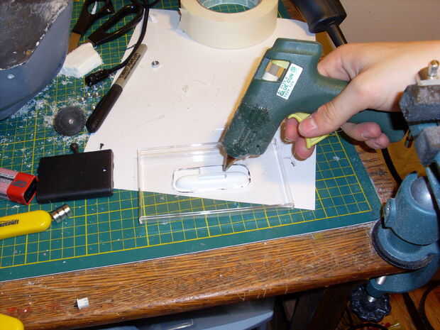 Coloque la cuna en el orificio. Cinta adhesiva por lo que permanece en su lugar y caliente cuidadosamente pegamento alrededor de los bordes para no mostrar el otro lado.