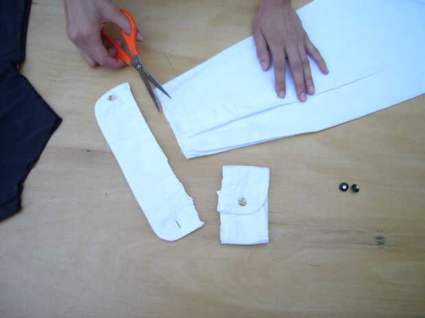 Cortar los puños de una camisa de vestido blanca y reemplazar los aburridos botones que están allí con algo más fresco.