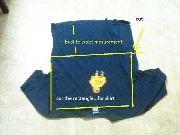 Vamos a usar la parte inferior de la parte superior.. .so invierta su T Medir la longitud de busto superior a la cintura... Añadir 1" para coser y cortar. cortar el resto forma un rectángulo para la broca de la falda.