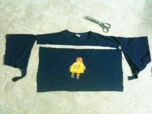 una vieja camiseta y un pañuelo nuevo infinito.Materiales1 camiseta XL blanca2 tazas de café molido4 tazas de agua2 cucharadas vinagre1. cortar la camiseta debajo de la axila derecha por encima de la costura parte inferior.2. en una olla grande poner