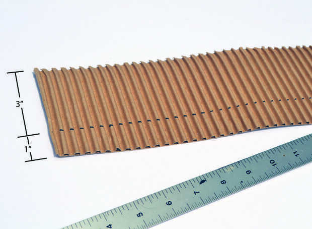 Tome el pedazo de cartón corrugado y medir tu cabeza con una superposición de 1". Anotar 1" del borde y doblar las flautas hacia ellos mismos. Cortar el pedazo de corona de centro y asegúrese de que la parte superior e inferior del diamante se alinean con las flautas verticales. (de modo que doblará)