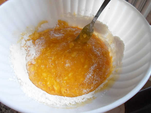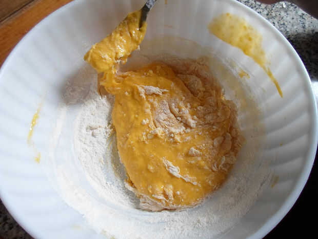 Seguir mezclando todo con un tenedor y vierta un poco de harina a la vez.