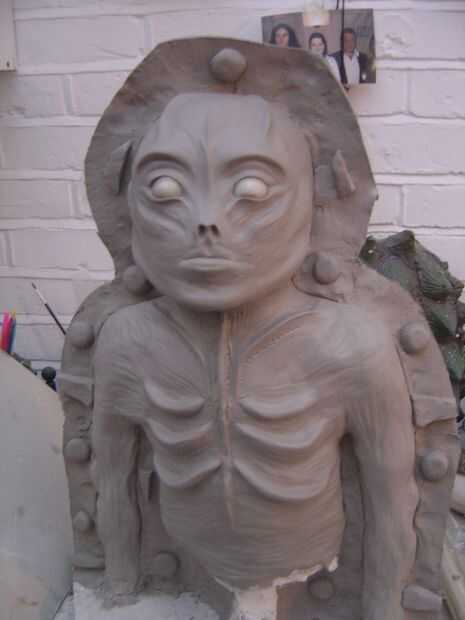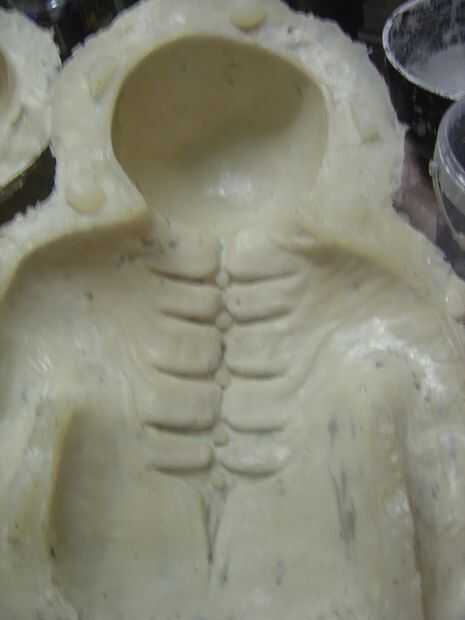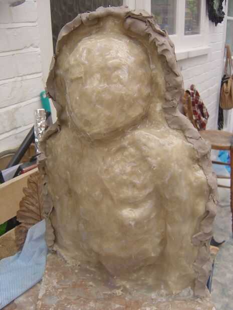 Haciendo la pared alrededor de la escultura, recuerda hacer las llaves! Estoy usando silicona de cura platinium para hacer la primera capa del molde. Después de que se seque aplico fibra de vidrio con resina, tendrá que dar molde a la fuerza. Cuando la primera parte del molde está lista tomar la pared de aplicar cera RELISE agente. Que comenzar a poner silicona en el molde de la parte 2. Repita el proceso con fibra de vidrio. Dar sea un día y lo desarma con cuidado.