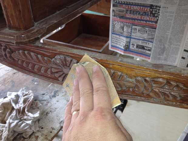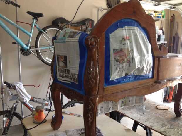Esta pieza tenía algunas zonas tapizados. Le gustaba a la tela, así que tuvimos que enmascare las áreas. Esta es la etapa para cubrir cualquier imperfección con plaste o masilla de madera. Una vez seco cualquier manchas llenas, todas las secciones de madera Haz lijadas para que la pintura se adherirá mejor. Fui sobre todo con un trapo de polvo.