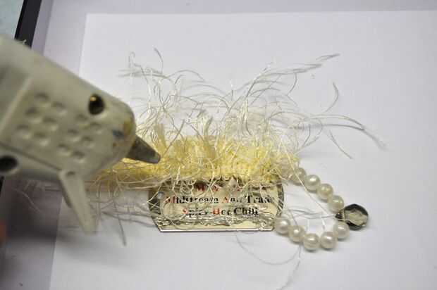 Si es desentrañar el extremo de la moldura cortada para que tenga un borde fresco. Aquí viene la parte calcular visualmente. Usted debe decidir cuánto de las necesidades de recorte los bordes de la etiqueta de perro y aún así es suficiente para ocultar la etiqueta de perro en el centro donde la pieza central va a ser. (Desde mi Adorno no era amplia bastante decidí dejar que la caída sea muy pequeña. Desde mi cameo a pequeño de altura he decidido añadir un arco). Cuando has decidido, pegar el extremo de la moldura, comenzando en el centro de la parte inferior (donde los granos están en). Secciones cortas de la cola a la vez para evitar que el pegamento de secado rápido para. Esto ayudará a mantener la guarnición plana y fácil de maniobrar si un error se hace.