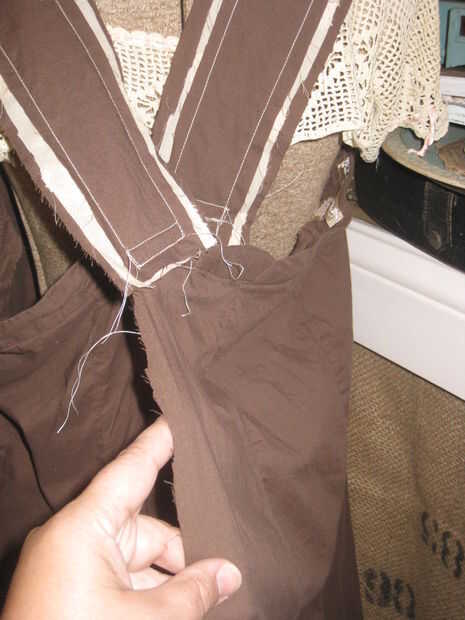 2. decida cómo ancho desea las correas (mina son aproximadamente 3 pulgadas de ancho) y cortar un par de tiras de material de revestimiento que se corta de la falda. aprox 3" de ancho X"su medida"largo. Puede hacer tiras extras y coserlas juntas para un estilo de capas y añadir un trozo de tela contrastante entre ellos mayor definición como lo hice con la tela tan. Incluso utilicé un color contrastante de hilo para un poco más de detalle. extremos del hilo de rosca se quedaron sin cortar a propósito para una mirada rota. Los bordes de la tela quedan unhemmed para facilitar así ese estilo.