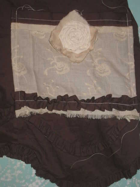 4. para crear los bolsillos que simplemente decide cuánto quiere el bolsillo y cortar un rectángulo de tela del material del trazador de líneas y coser por tres lados al frente de su delantal, sin necesidad de girar a los lados debajo a menos que desee. Puede Agregar a tela contrastante para el frente de tu rectángulo igual o no. Añadir un rosetón de tela, flores tela, pin decorativo, diamantes de imitación lo que usted quiere embellecer su delantal con.