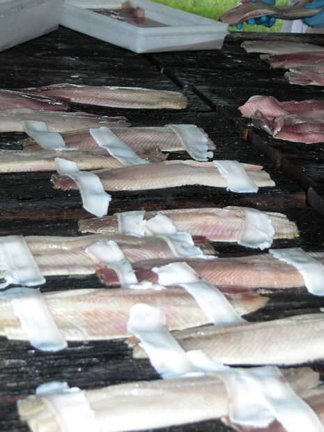 Empezar por trazar el pez en las juntas por lo que hay sobre 3-4" entre los cortes. Coloque las tiras de carne de cerdo en la parte superior e inferior de los peces. La carne de cerdo hace dos cosas: sabores del pescado y ayuda a la mantienen unida. Según la gente de Rotary, una vez que el pescado ha sido deshuesado, tiende a desintegrarse para que la carne de cerdo ayuda a mantener todo junto. También, sabe bien.