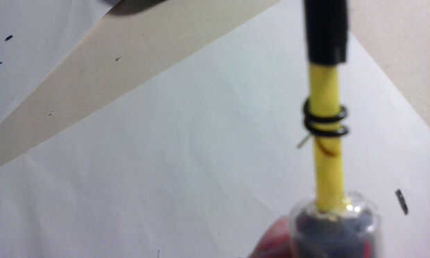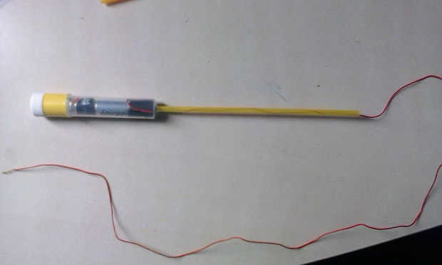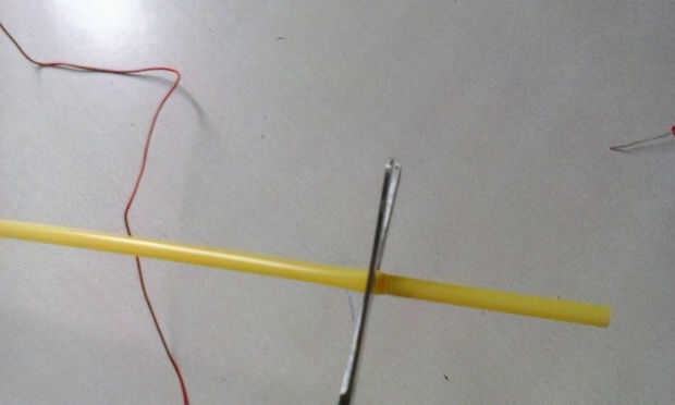 Caliente pegar la paja encima de la jeringa y con cinta adhesiva, mantener temporalmente en su lugar el cable que has dejado fuera de la paja.