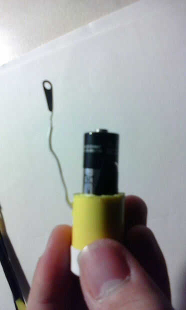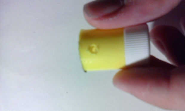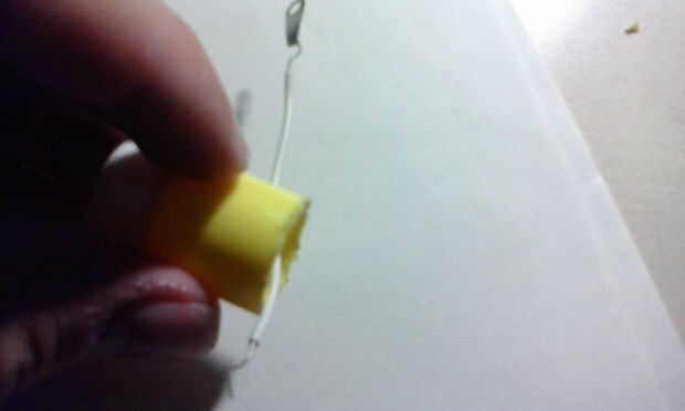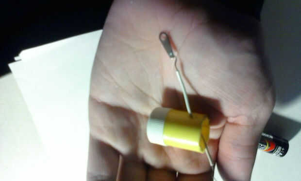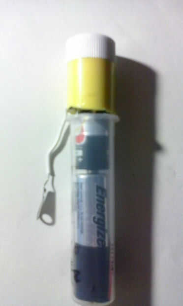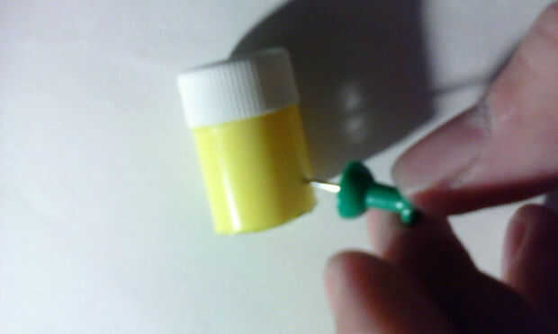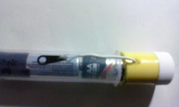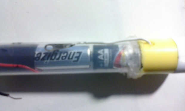 Abra un agujero en la parte de palillo de pegamento para que el cable del interruptor sobresale y luego pegamento caliente la jeringa y el pegamento stic parte juntos, como se muestra arriba.