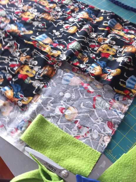 Hacer un cojín de tamaño apropiado de cuatro capas de una vieja manta de lana, luego cortar un trozo de tela de aproximadamente tres veces el tamaño de la almohadilla (más espacio del dobladillo). Dobladillar los bordes de la tela, luego coser sobre el cojín del paño grueso y suave. Debería verse como la imagen 2.