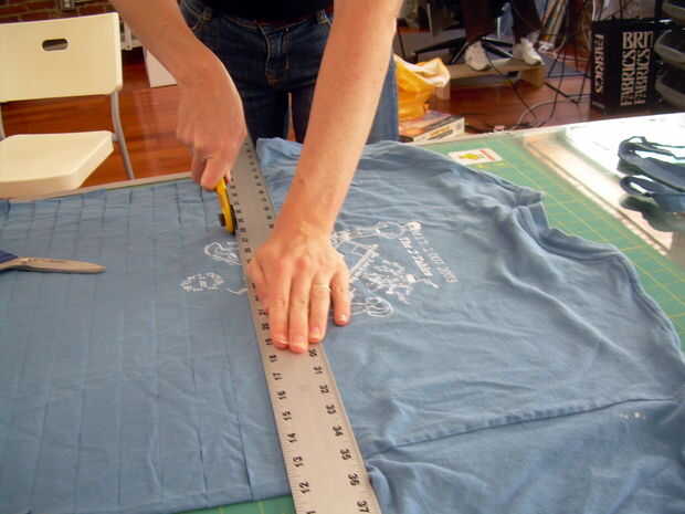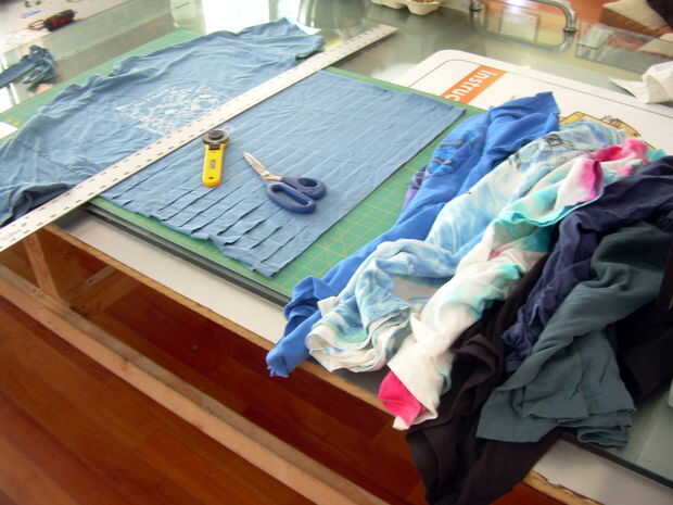 Diseñar tu camiseta en la estera y cortar en tiras ~ 1,25" con su cortador rotatorio. Convertir el tanto de cada camisa en tiras como sea posible - es mejor que las sobras que al funcionar hacia fuera.