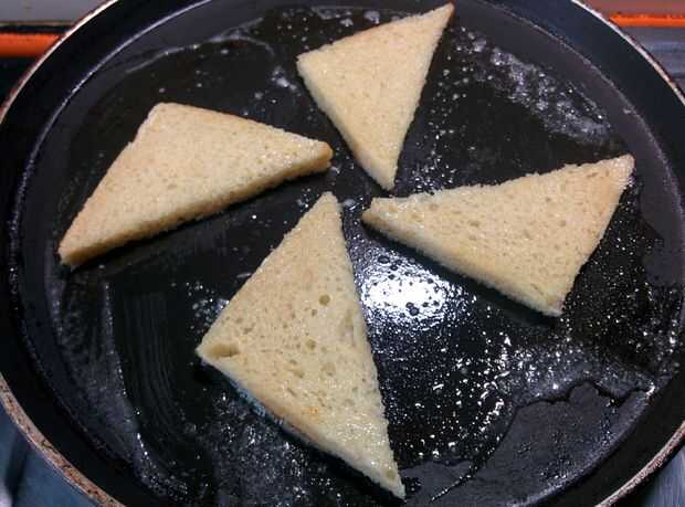 - Freír las piezas de pan a medio fuego hasta marrón de oro.