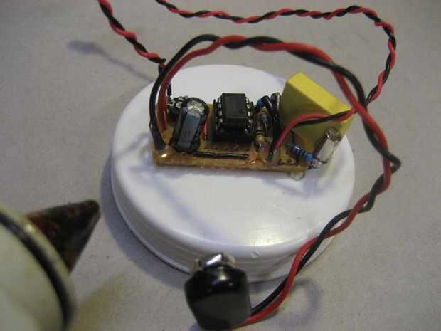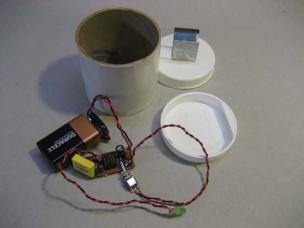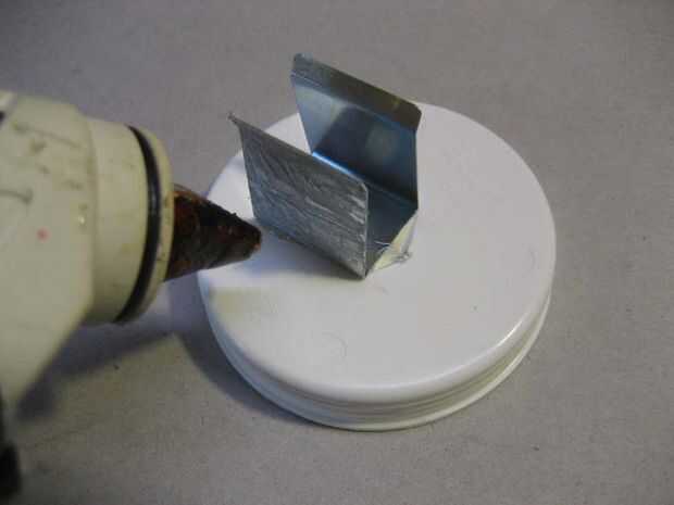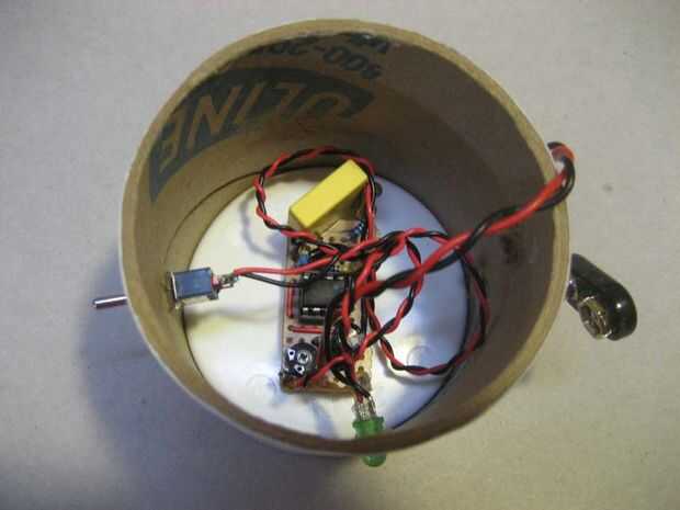 Disparar la pistola de pegamento. Encolar la Junta de la tapa superior de tubo un correo electrónico (debe ser etiquetada temporizador Shake). Pegar el clip de la batería en la parte inferior tubo de tapón (debe ser etiquetados como batería) de correo. Nota: Es probablemente mejor montar la batería en su costado, no en el borde como se muestra en la foto. Jugar con la ubicación de la batería y usar lo mejor. No hay mucho espacio dentro.