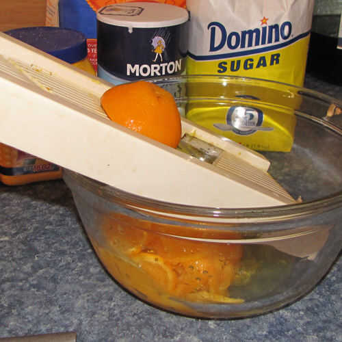 Para empezar, cortar las naranjas por la mitad y los de semilla. A continuación cortar la naranja la mitad de delgada como sea posible, ya sea usando una mandolina o un cuchillo muy afilado (cáscara y todo). A continuación apriete las rodajas de naranja por un colador y reservar el jugo en un recipiente separado. Están buscando al menos una 1/2 taza. También, ser mente lleno de semillas sueltas.